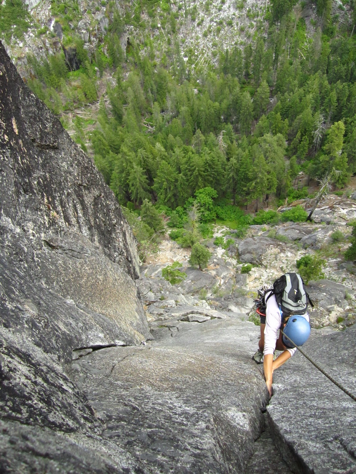 | Looking back up at our ascent (right ridge) and descent route (west ridge) |