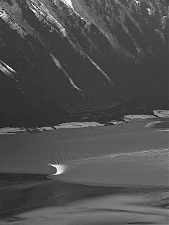 Most witness the Bore Tide from pullouts along the Seward Highway. From these vantage points, you can get a great sense of the fury and awesome power of the wave. But from high above, the beauty and scope of the wave becomes obvious. Instead of a 5 minute noisy display of raw power, we were treated to a full hour of grace and fluidity in the silence of the mountains. Eventually, the Bore Tide weakened and slowly faded in a deep channel on the far side of the Arm.